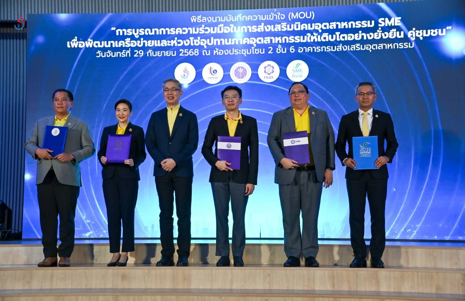 กรมโรงงานฯ จับมือ 4 หน่วยงาน จัด MOU ใหญ่! ปั้น ‘นิคมฯ SMEs’ หนุน ธุรกิจไทยแข็งแกร่ง เมื่อวันที่ 29 กันยายน 2568 กรมโรงงานอุตสาหกรรม (กรอ.) ร่วมผนึกกำลัง 4 หน่วยงานพันธมิตร ได้แก่ กรมส่งเสริมอุตสาหกรรม (DIPROM), การนิคมอุตสาหกรรมแห่งประเทศไทย (กนอ.), ธนาคารพัฒนาวิสาหกิจขนาดกลางและขนาดย่อมแห่งประเทศไทย (SME D BANKS) และสำนักงานปลัดกระทรวงการอุดมศึกษา วิทยาศาสตร์ วิจัยและนวัตกรรม (สป.อว.) ร่วมลงนามบันทึกความเข้าใจ (MOU) เดินหน้าสร้าง “นิคมอุตสาหกรรม SMEs” เพื่อรองรับผู้ประกอบการขนาดกลางและขนาดย่อมในการย้ายถิ่นฐานหรือขยายการผลิตเข้าสู่พื้นที่นิคมฯ ที่ได้มาตรฐานและเป็นระบบ